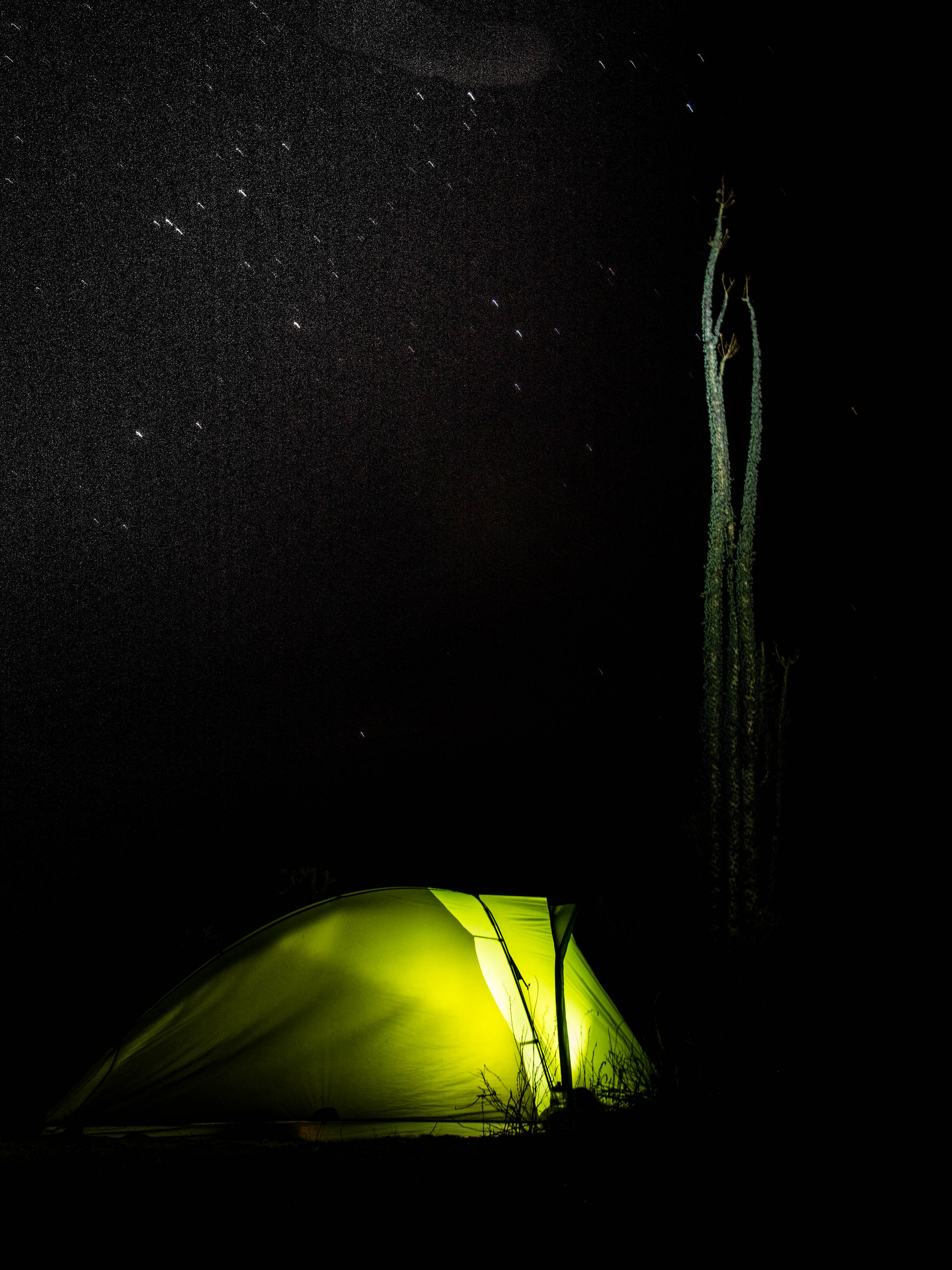 Desert camping amidst curio trees, resembling something out of ‘Day of the Triffids’