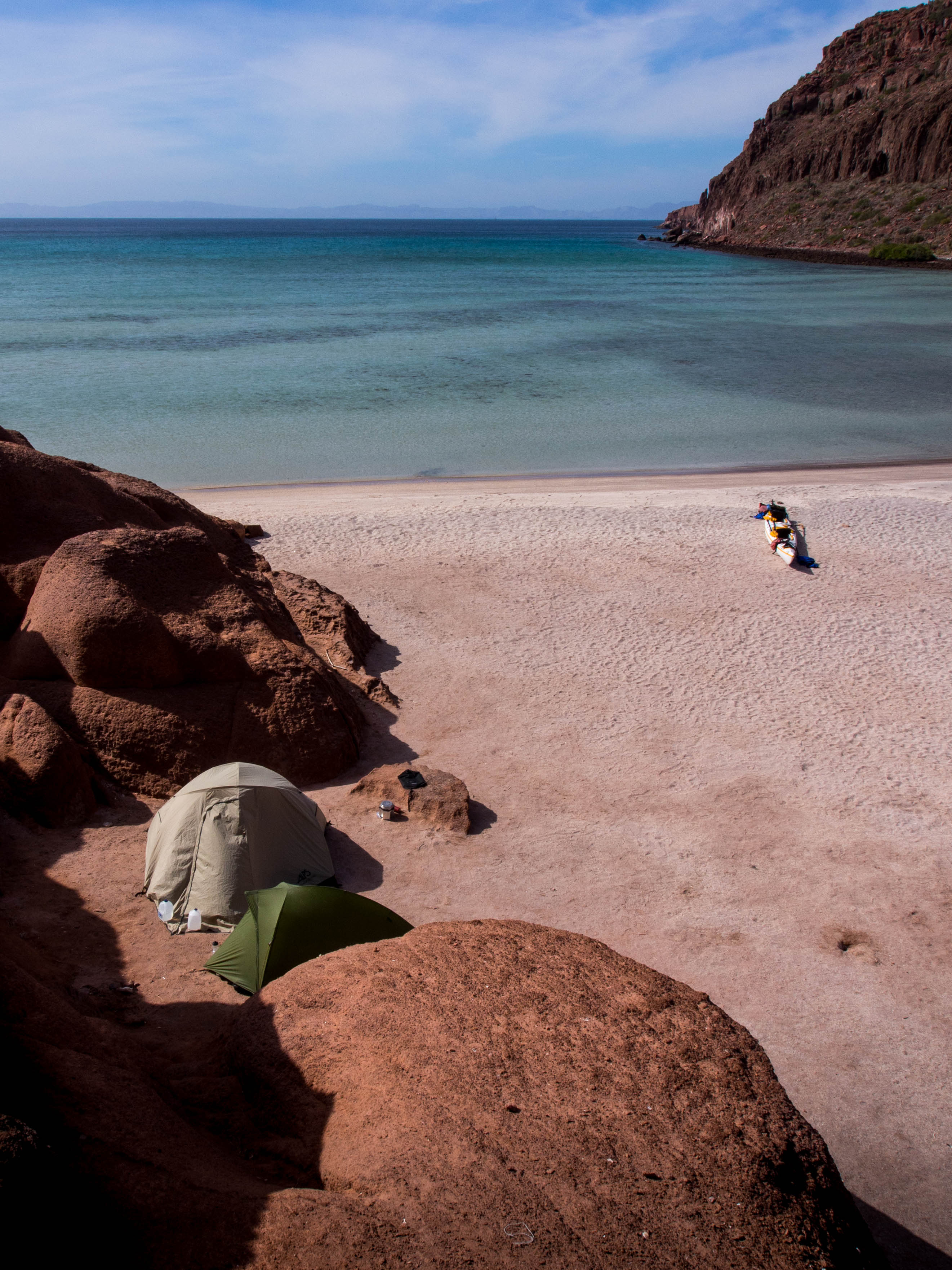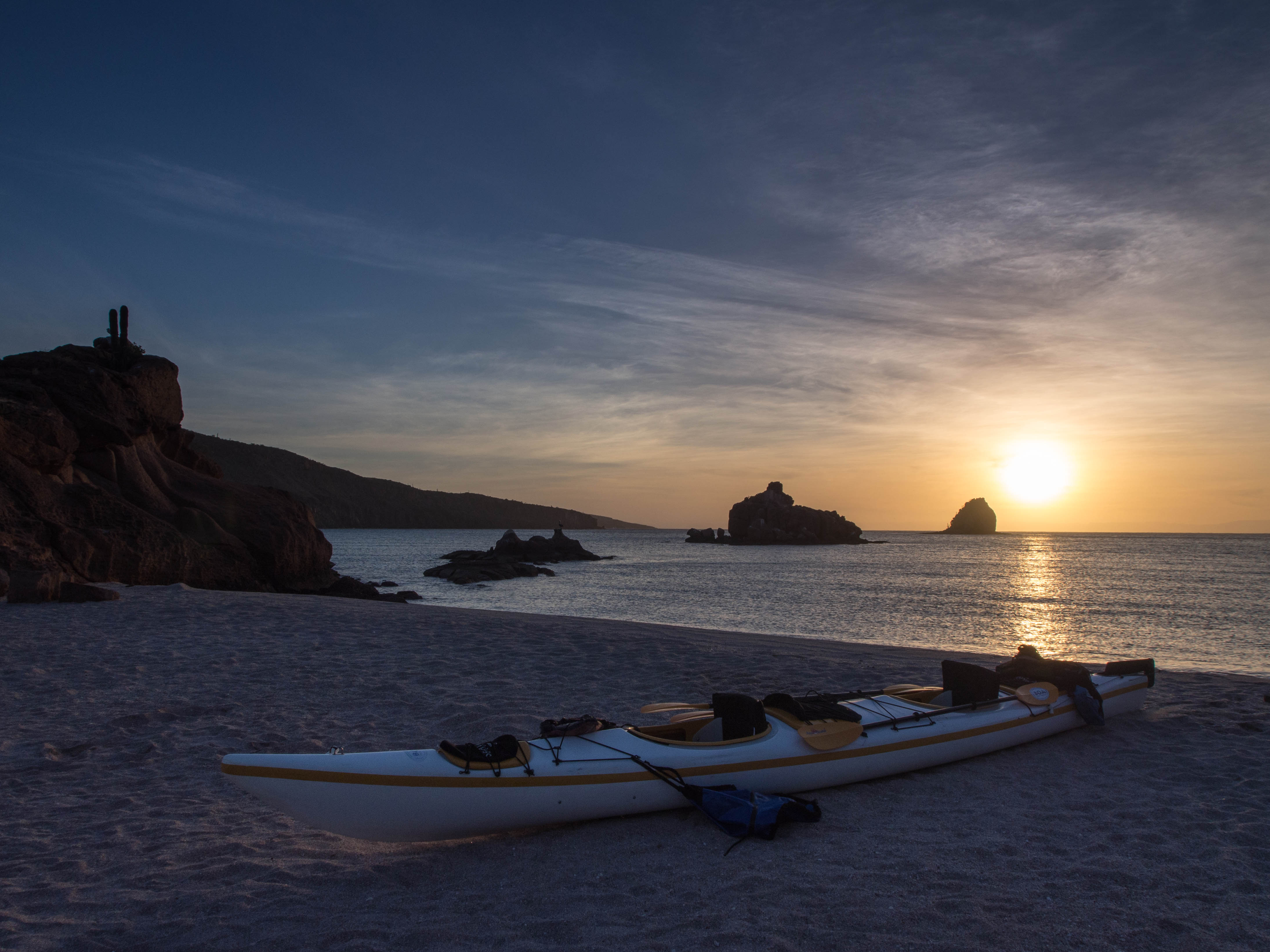 I arrived in La Paz just before my friend James flew in from the UK, and for the next three weeks the bike would take a back seat. It was great to see a familiar face (even if it was at 1am) and after catching up we were soon busily preparing for the next adventure – an eight day kayak trip circumnavigating the island of Espirito Santos. Whilst intended to be more ‘beach chilling’ than hardcore paddling it required packing enough supplies to be self sufficient for the whole duration, including all drinking water. With some mild exaggeration of prior experience I’d managed to convince an outfitters to rent us a double sea kayak, which we stuffed to the gunnels and then set off in search of island paradise. After some pretty hairy first days, prompting both of us to question what the hell we’d signed up for, the winds thankfully settled and we were able to cruise from one small, deserted beach to the next, jumping out for the odd snorkel with a friendly sea lion colony. Standard stuff really.