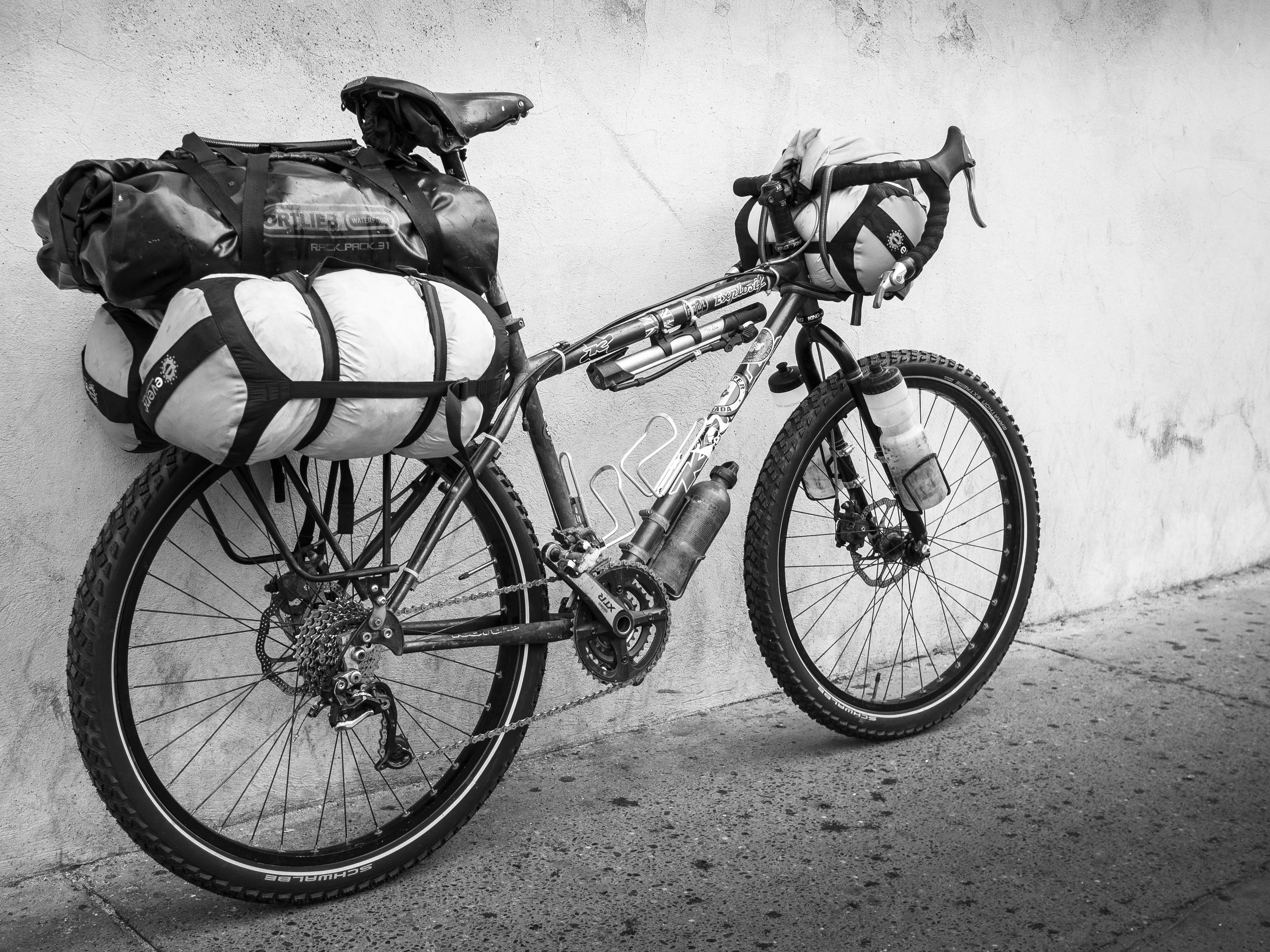 •  1 x Ortlieb 30L Rackpack – Slung over rear rack and fastened by a rachet strap, as well being connected to the dry bags on either side