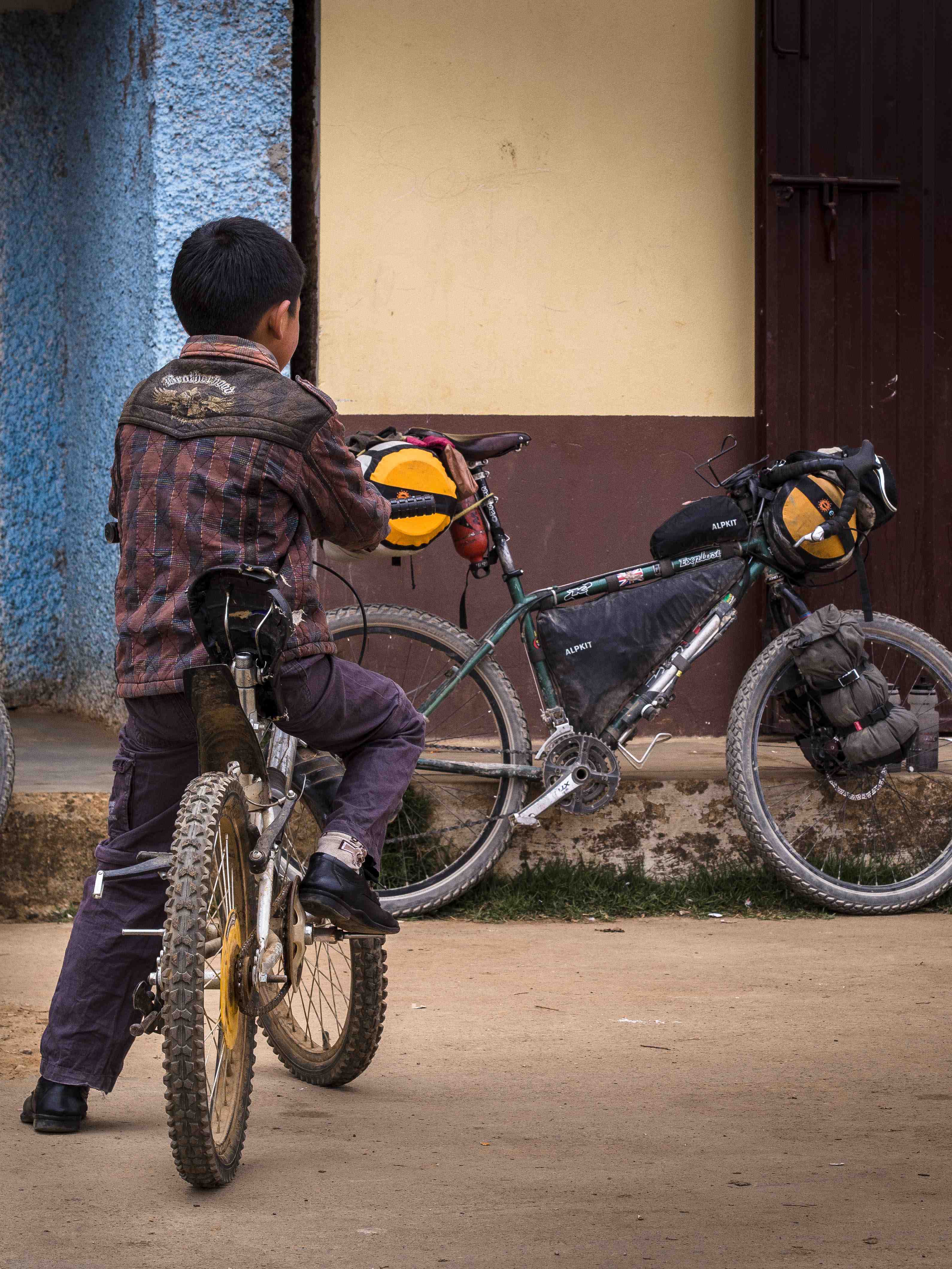 The following morning saw us veer off the paved road just before Huamachuco and commence a sandy climb back into the unmapped. Refuelling in the village of Curgos this curious little chap checks out my set up, no doubt asking himself where on earth the racks and panniers are?