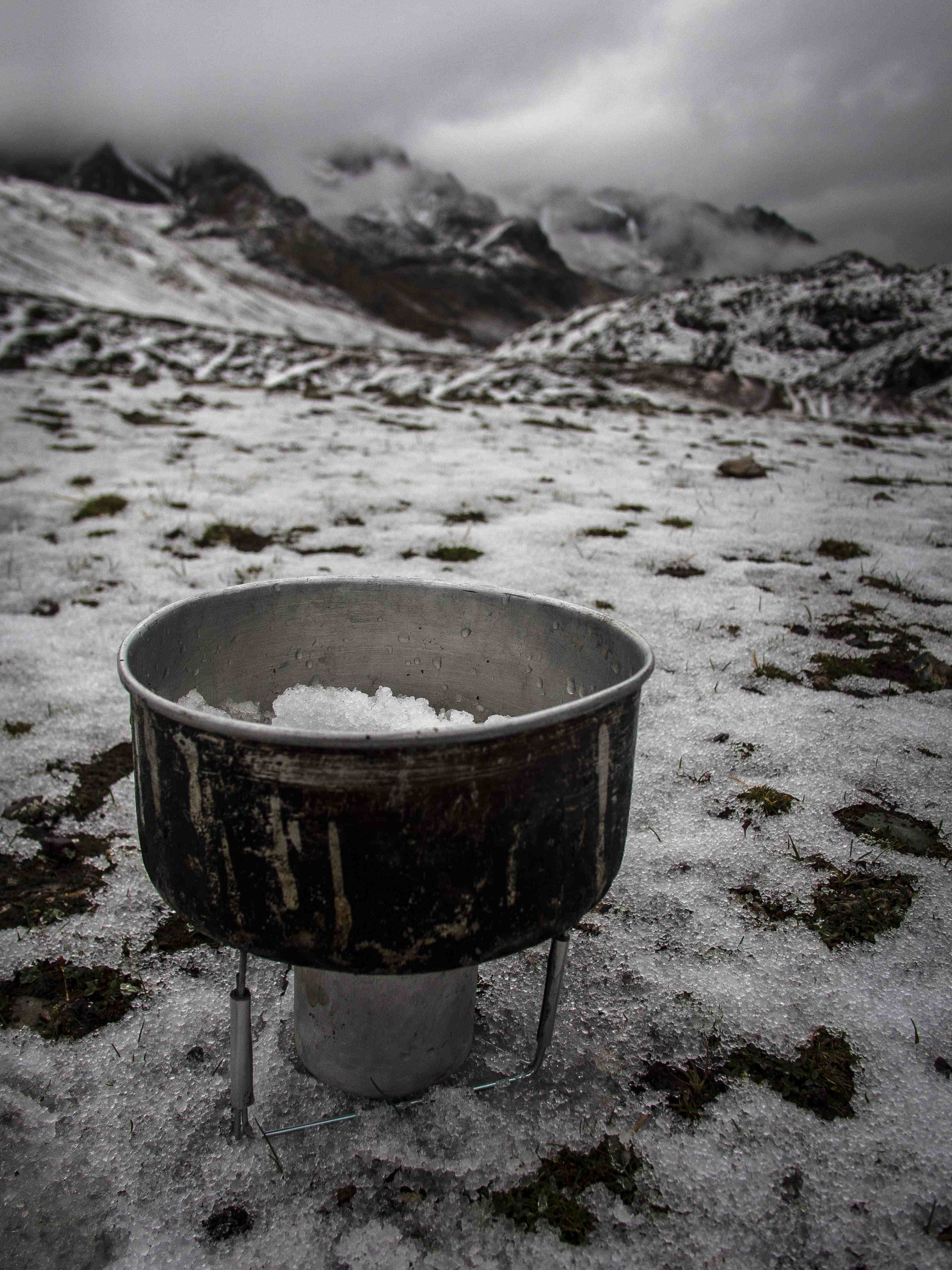 Time to put my new beer can stove (basically a beer can as the name suggests) through its paces and rustle up some dinner. Boiling ice at 4750m, not bad going for a $1 bit of kit.