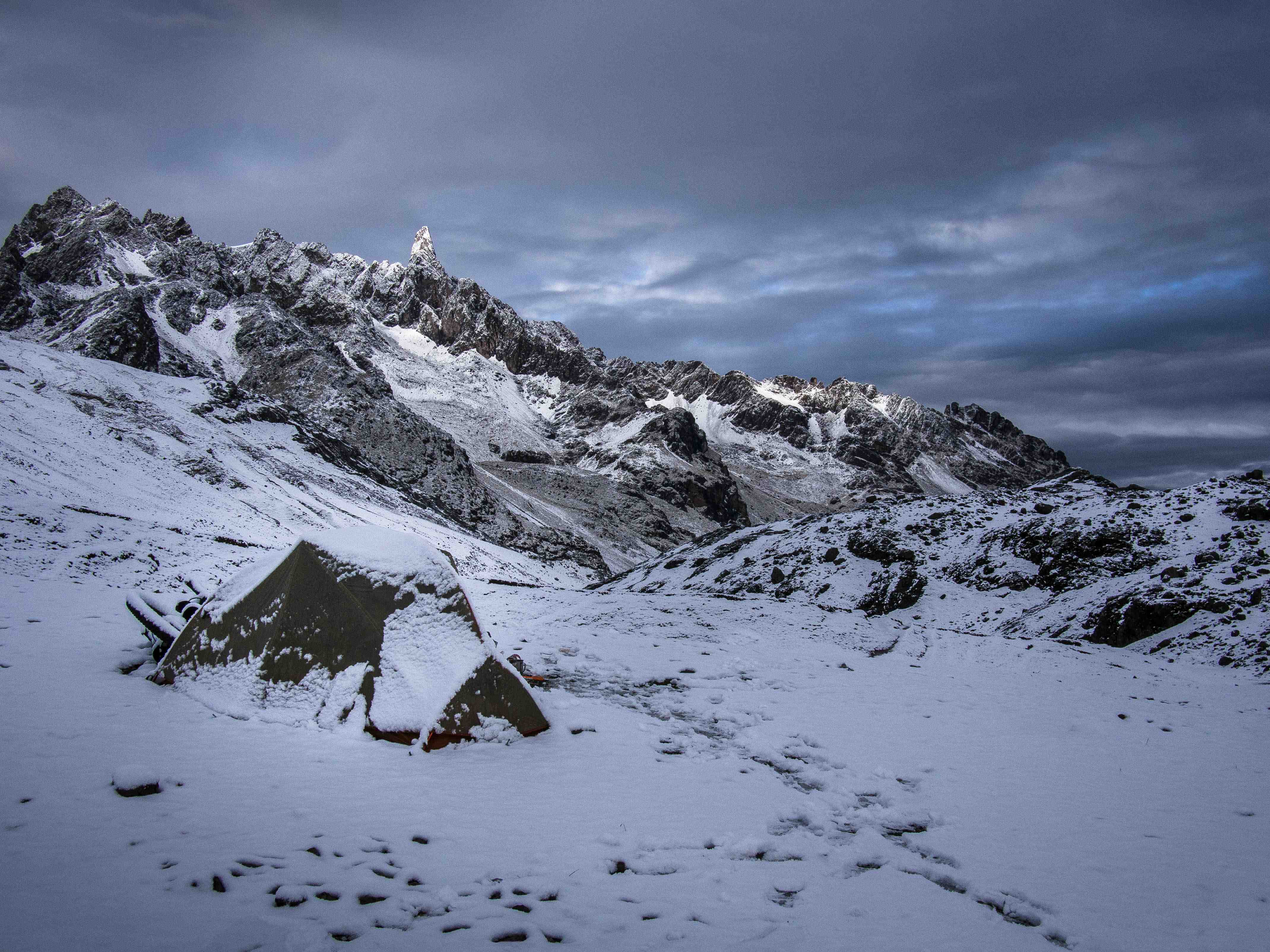 Keen to avoid a repeat of last night’s incident I decided to push on past all signs of human activity and optimistically made a bid to tackle the second pass. Progress was brought to an abrupt halt though by the onset of a ferocious hailstorm, which gave me little choice but to throw up the tent where I happened to be and take cover.