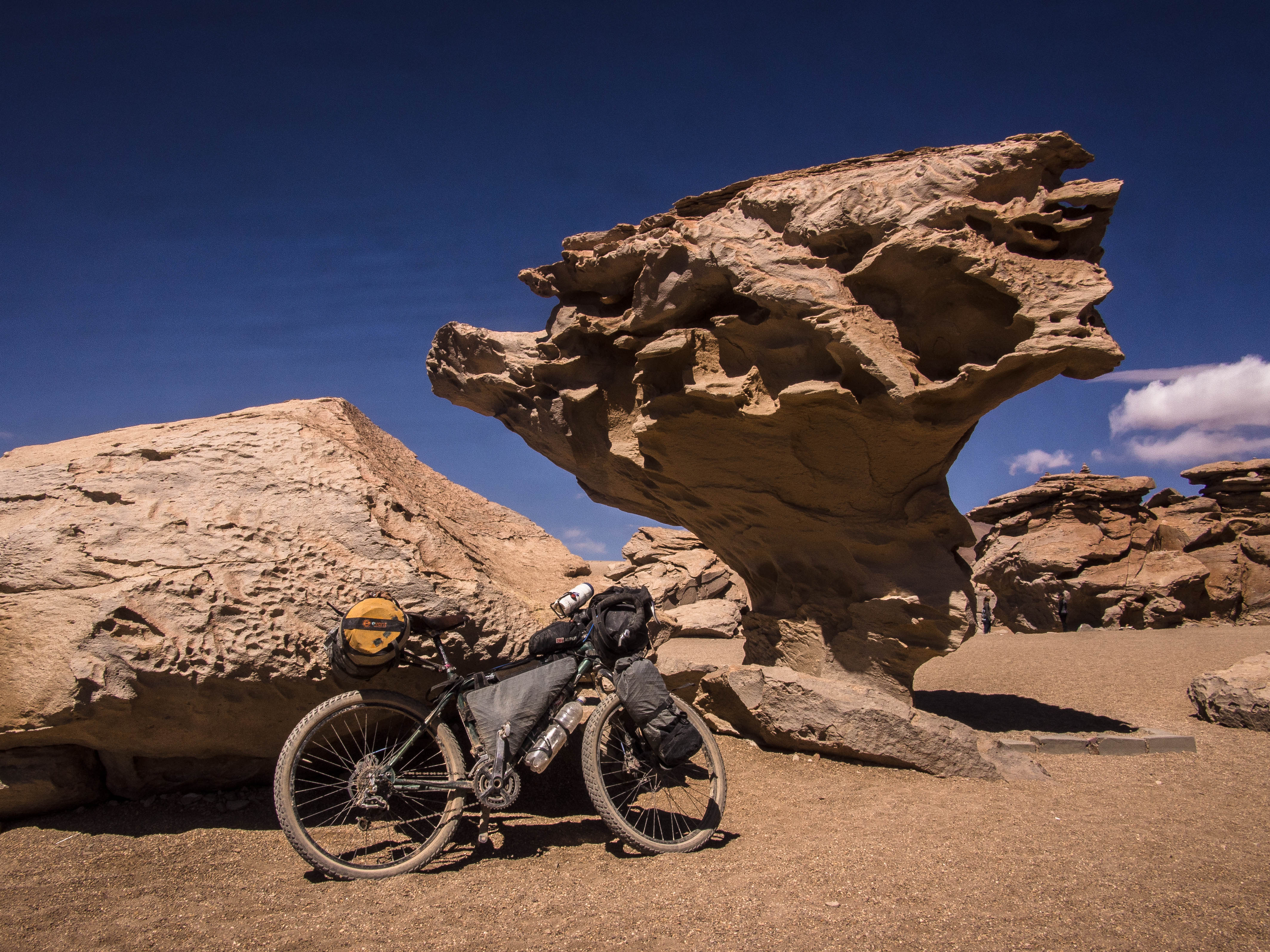 The TKguide is pretty much all you need. Route finding is easy, just follow the jeep tracks, but you obviously need to plan water resupply points and possibly also camping locations. There’s a shop at Laguna Colorada with everything you are likely to need; pasta, tinned food, salsa, buscuits etc. Don’t bank on averaging more than 10km/hr. If riding light with sensible tyres it is possible to ride it all, I pushed only a matter of metres, but I managed to avoid what I believe is the worst stretch south of the Hotel Desierto turn off by going way to the east of the main track. This was done on the advice of a jeep driver, basically at the hotel turn off bear left and follow the series of tracks up away from the main track. The further away you can get from it the better, I was probably about 1km to the east of it, then everything rejoins just past the rock outcrop around 10km south of the turnoff. Finally, if you’re travelling heavily loaded with four panniers and road tyres, I’d think long and hard about doing this route. I know it seems like ‘everyone’ does it, but I can only imagine how unenjoyable the riding/pushing would be…