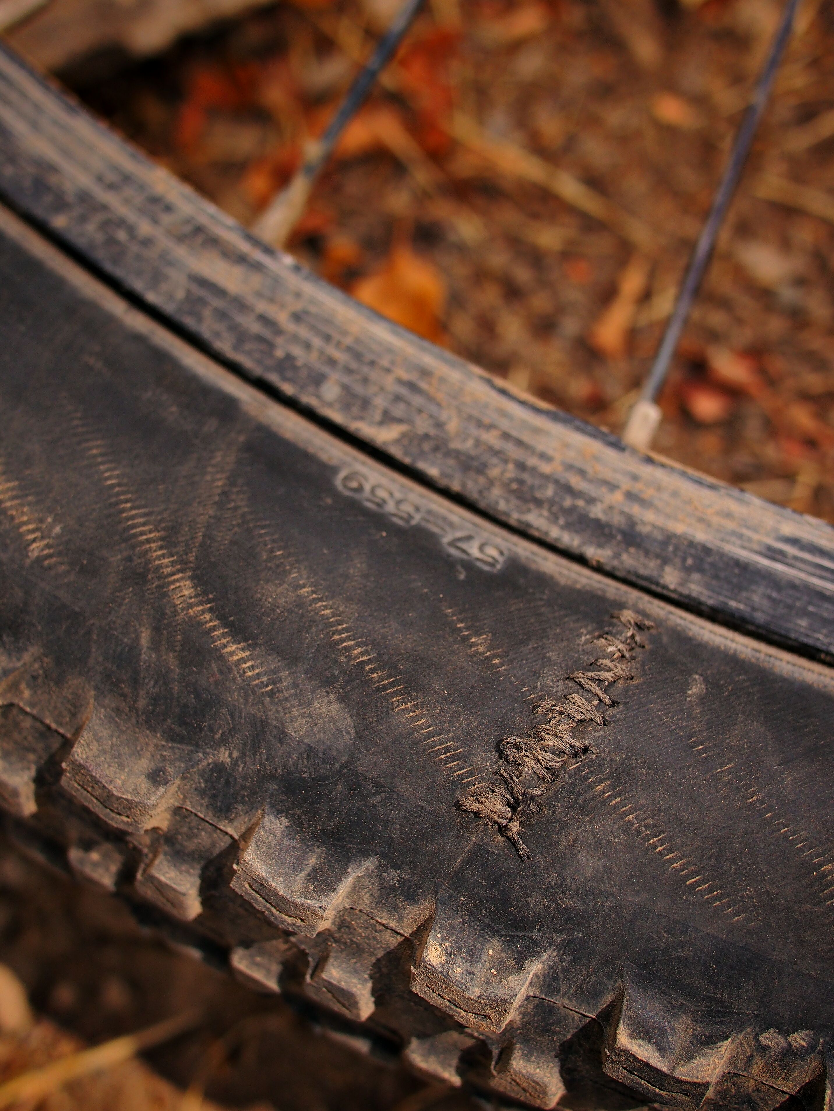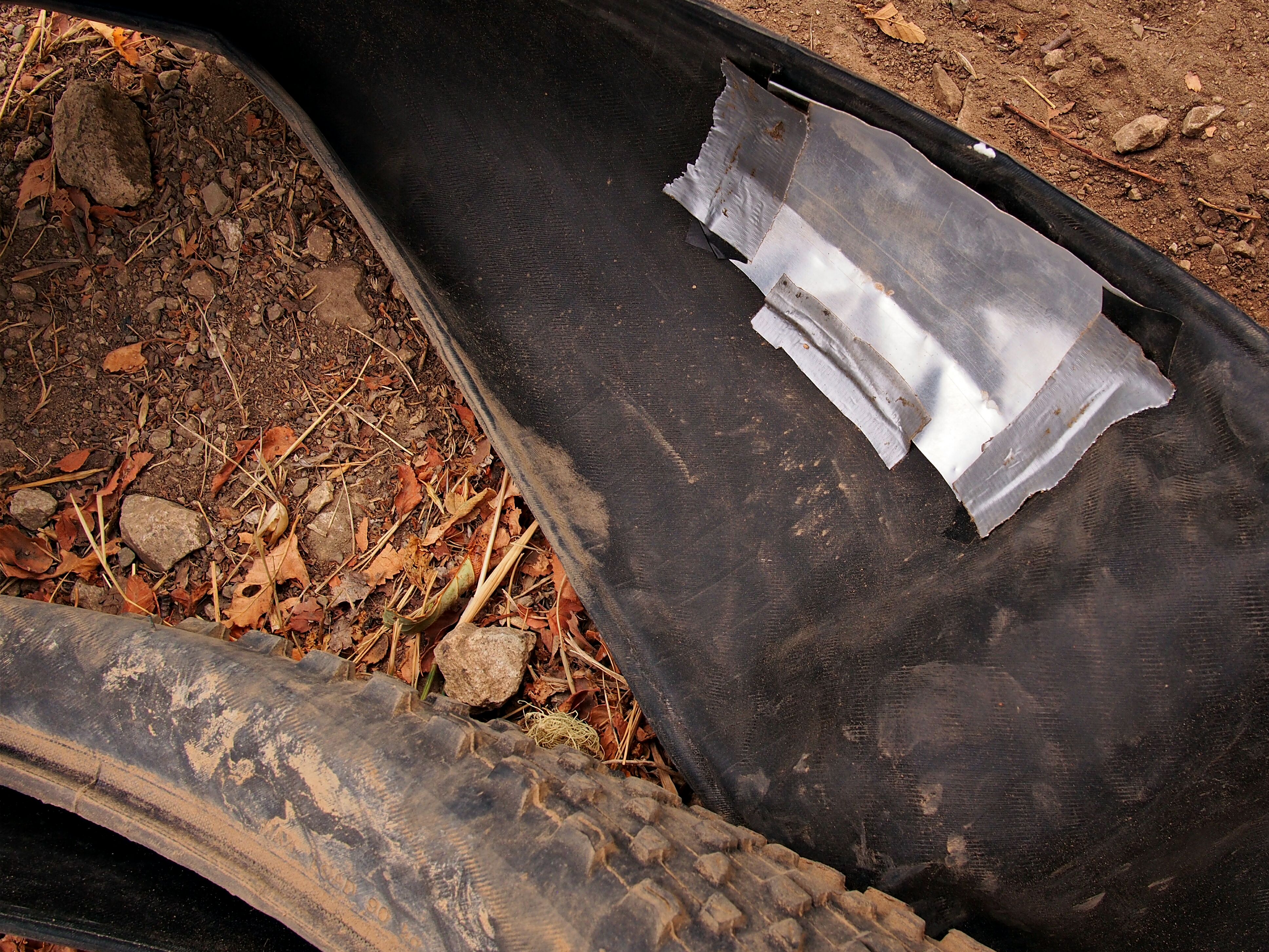 Possibly getting a bit carried away with the top notch trail riding, I managed to tear the sidewall of my front tyre on a rock. Always a worry on off-road adventures and a more conventional cycle tourist would likely have a spare tyre or two waiting in the wings for such eventualities. No such luxury in our case though, so out came for the needle and thread…
